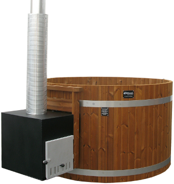 - Komplett badtunna av plast med extern vedkamin & dubbla lock, för nedfällning i terrass